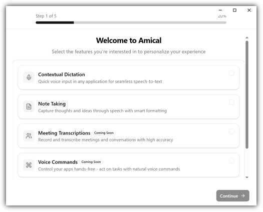 僕の場合は Contextual Dictation と Note Taking をチェックして進みました。
